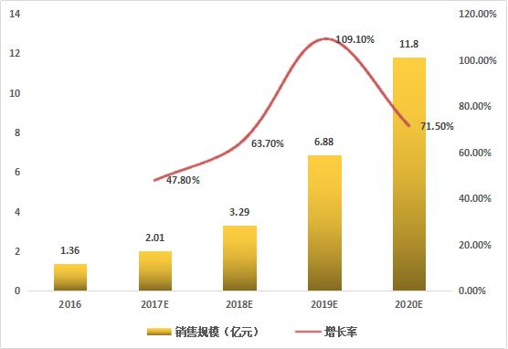 根據(jù)艾媒咨詢數(shù)據(jù)顯示,2016年中國(guó)智能音箱銷售規(guī)模為1.36億元,預(yù)計(jì)2017年將突破兩億,達(dá)到2.01億,增長(zhǎng)率為47.8%;預(yù)計(jì)到2020年,智能音箱銷售規(guī)模將超過10億元。目前雖眾多廠商已推出智能音箱產(chǎn)品,但市場(chǎng)總體銷售規(guī)模仍處于較低水平,隨著產(chǎn)品進(jìn)一步優(yōu)化升級(jí)及智能家居的推廣,中國(guó)智能音箱消費(fèi)市場(chǎng)潛力將得到釋放,行業(yè)有望迎來(lái)爆發(fā)式增長(zhǎng)。