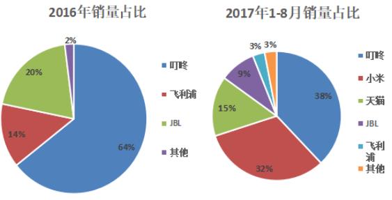 2016年整體智能音箱呈京東叮咚壟斷的趨勢(shì),占比高達(dá)65%,飛利浦與JBL占比分別為14%、20%。2017年隨著更多廠商加入到智能音箱的市場(chǎng),整體市場(chǎng)格局發(fā)生了改變,叮咚的市場(chǎng)份額降到38%,小米緊追其后,占比32%。