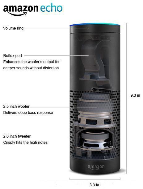 以Echo音箱為例,Echo采用封閉式揚(yáng)聲器設(shè)計(jì),高音和低音喇叭上下相對(duì),聲音各個(gè)方向是對(duì)稱的,這有利于前端信號(hào)處理,但音效會(huì)受到限制。