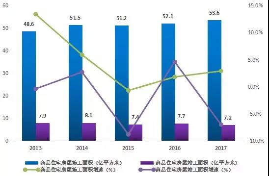 2013-2017年中國商品住宅房屋施工面積和竣工面積