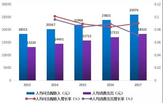 2013-2017年中國居民人均可支配收入和消費(fèi)支出