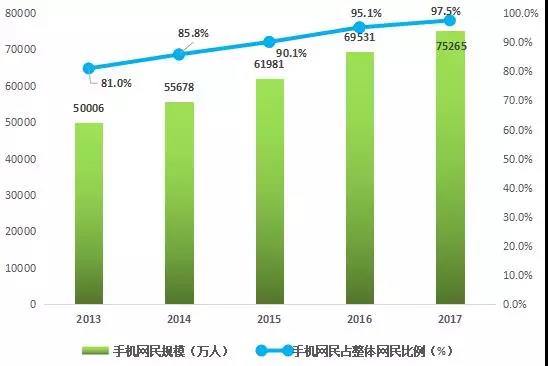 2013-2017年中國手機(jī)網(wǎng)民數(shù)量及其整體網(wǎng)民比例
