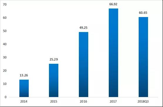 2014-2018Q3中國智能家居行業(yè)融資規(guī)模(億元)