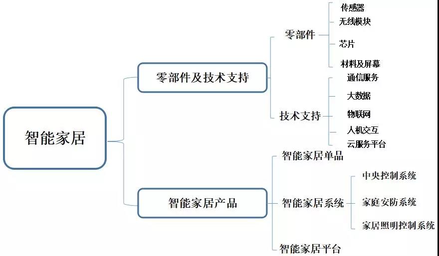 簡單來看,智能家居產(chǎn)業(yè)鏈可以看成由兩部分構(gòu)成,即零部件及技術(shù)支持和智能家居產(chǎn)品。