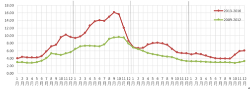 具體來看,2016年初生姜上市平穩(wěn),供應(yīng)持續(xù)增加,價(jià)格穩(wěn)中略降,主要原因是2016年生姜供應(yīng)面異常充足,而需求面持續(xù)表現(xiàn)低迷,且參市各方購銷積極性均受其打擊,導(dǎo)致整個(gè)老生姜交易階段的價(jià)格保持低位。新生姜上市之初,開秤價(jià)格并無優(yōu)勢,直到后續(xù)因積年庫存吃緊和新老交替青黃不接的斷口期出現(xiàn),加之高種植成本下的連年低價(jià)使姜農(nóng)惜售情緒見長,才逐漸抬升生姜市場行情。