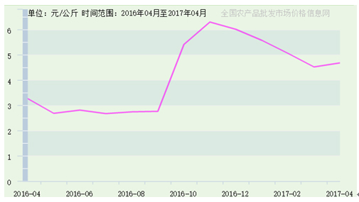 據(jù)全國農(nóng)產(chǎn)品批發(fā)市場價(jià)格信息網(wǎng)提供數(shù)據(jù),2016年4月至2017年4月,寧夏生姜價(jià)格趨勢與我國生姜價(jià)格總趨勢保持一致,如圖5所示。區(qū)內(nèi)生姜價(jià)格最高價(jià)出現(xiàn)在2016年12月15日,為7.2元/公斤,由吳忠市鑫鮮農(nóng)副產(chǎn)品市場有限公司上報(bào);市場最低價(jià)出現(xiàn)在2016年6月15日,為2.3元/公斤,由銀川北環(huán)批發(fā)市場上報(bào)。