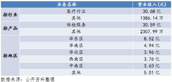 圖5、6、7是美年健康的營業(yè)收入構(gòu)成圖。按行業(yè)分,營業(yè)收入中,醫(yī)療行業(yè)占比99.55%,其他占比0.45%;按產(chǎn)品分,營業(yè)收入中,體檢服務(wù)占比99.25%,其他占比0.25%;按地區(qū)分布,營業(yè)收入中,華東區(qū)、華南區(qū)、華北區(qū)、西南區(qū)、中南區(qū)、其他分別占比為28.57%、16.57%、13.28%、12.61%、12.17%、16.80%。