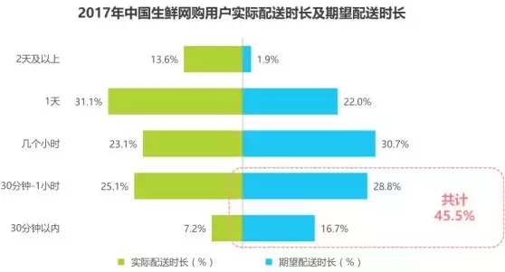 用戶期待更快速的配送體驗(yàn),45.5%的用戶希望配送時長在1小時內(nèi)。