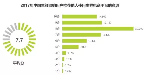生鮮網(wǎng)購用戶推薦他人使用的意愿較強(qiáng),整體推薦意愿的平均分為7.7分。30.7%的用戶推薦他人使用的意愿為8分,17.1%的用戶推薦他人使用的意愿為9分,14.9%的用戶推薦他人使用的意愿為10分。