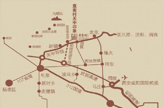 袁家村位于咸陽市禮泉縣,距離咸陽國際機場較近,空運便利,有利于吸引國際旅客前來觀光體驗。附近機場高速、武銀高速、312國道、107省道、關中環(huán)線等道路密布,交通發(fā)達,西安至禮泉、西安至袁家村、咸陽至袁家村的客運大巴發(fā)車頻率高,游客無論是乘大 巴還是自駕游都很便利。